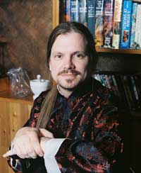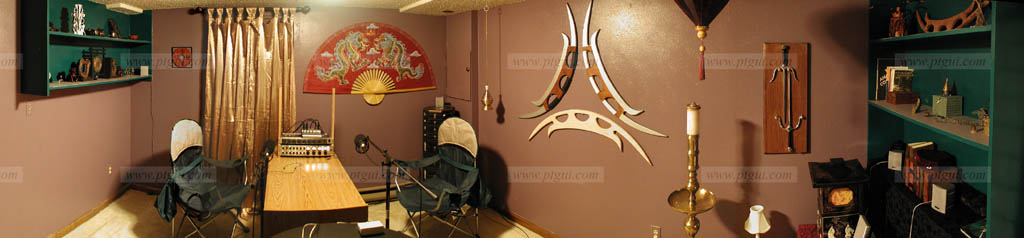 The Zen Room![]() This is where we record our podcasts. Our recording involves two Behringer B-1 microphones plugged into a UB802 mixing board. This passes through a T1952 Tube Composer (compressor), which levels out the signal so we don't have to do so much post-production work. It's then passed into a Yamaha UW10 USB AtoD for conversion into digital sound, and into whatever laptop happens to be sitting on the USB hub/cooling pad a the moment. We also pass an audio feed out of the Yamaha into a Behringer HA8000, which allows up to eight people to listen to the show simultaneously, although it's generally just Jim, his guest, and whoever is doing the sound engineering. We use Audacity to record our podcasts, to edit all extraneous noises out of the resulting wav file, to adjust final levels, and to mix in our chosen music. We then use Poikosoft's Easy Audio File Converter (which earns the name admirably) to convert the final wav to an mp3. We currently spend about fifteen man-hours per episode, not counting music search time, but we're learning ways to reduce that without sacrificing quality. |